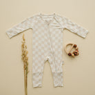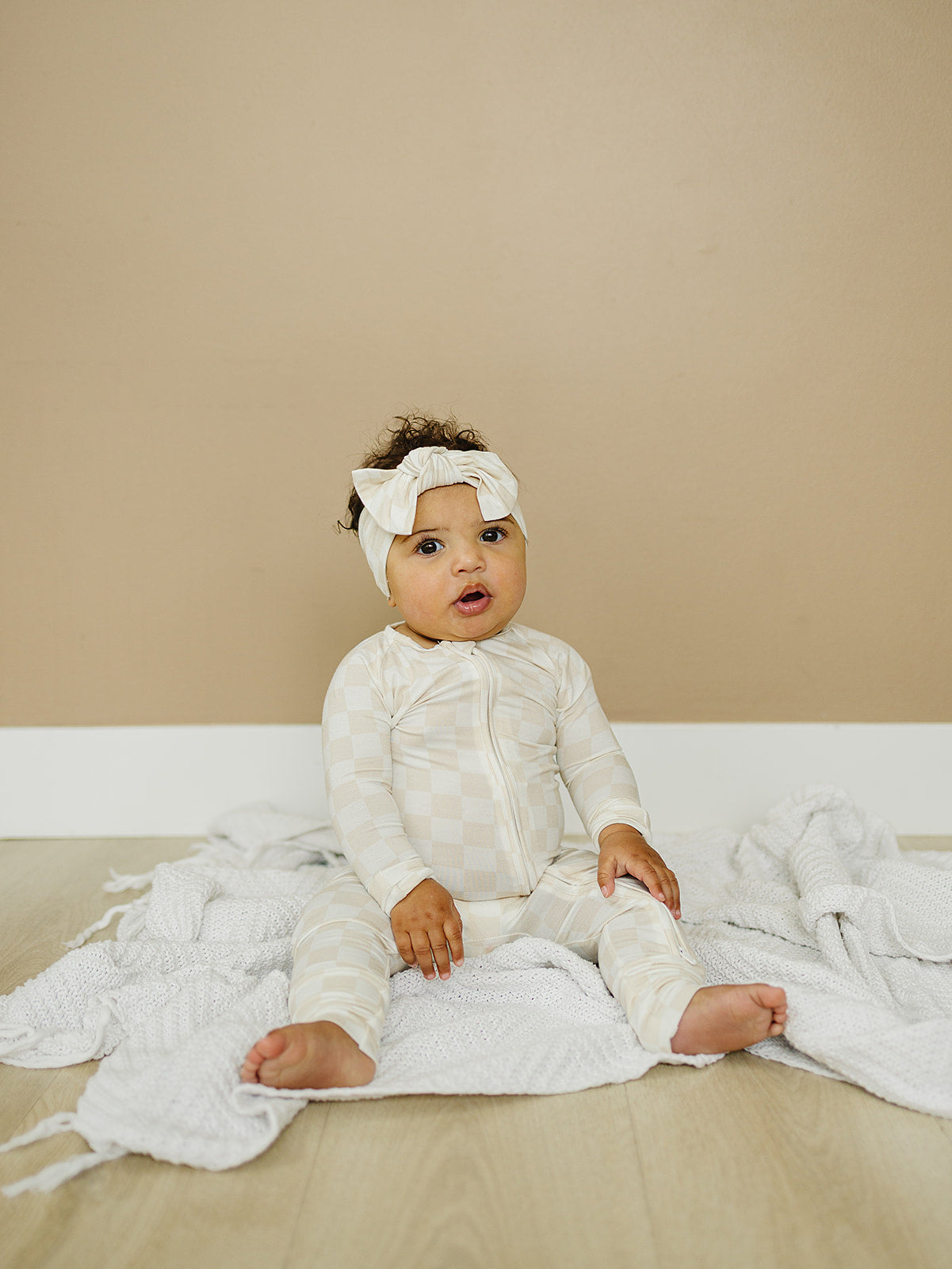 Beige Checkers | Bamboo Pajama + Bow Headband Set