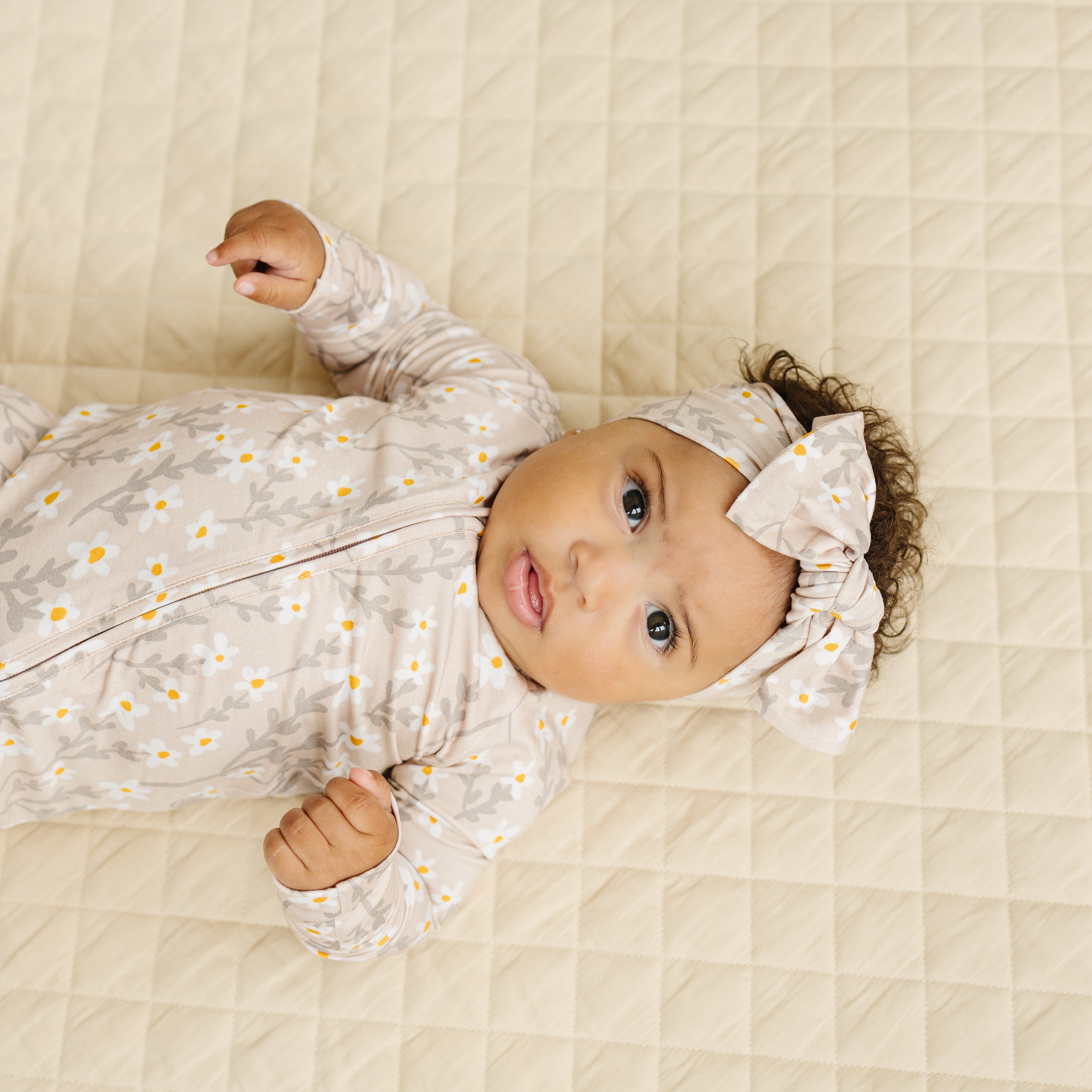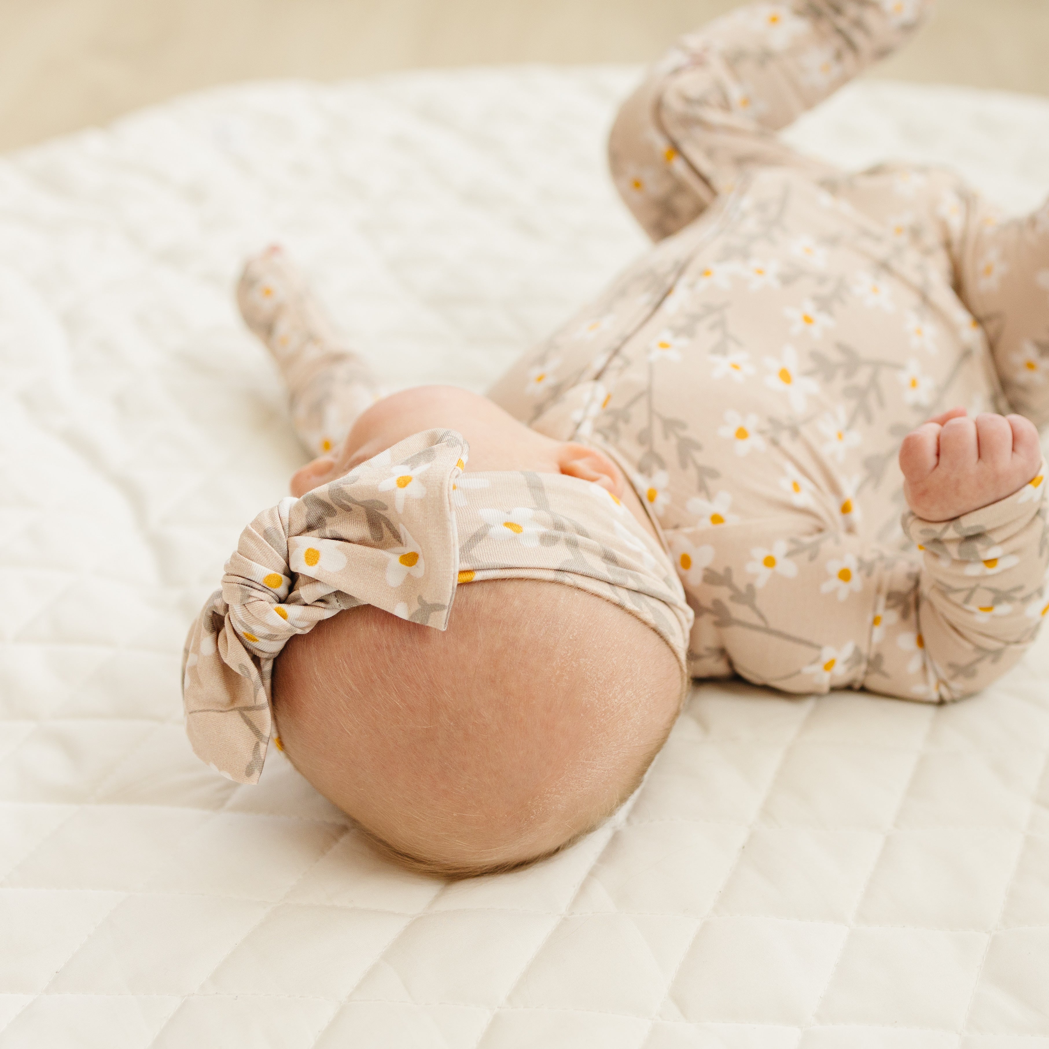 The Gracie bow headband features our signature wildflower print in calming neutrals, tied into a soft, stretchy bamboo bow perfect for newborns and little girls alike.